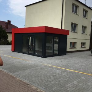 Czytaj dalejPodglądPawilon handlowo-usługowy z czterema witrynami i drzwiami aluminiowymi o wymiarze 6x3x2,7 metra.